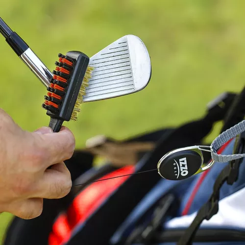 – El cepillo para palos de golf con cerdas de nailon se puede utilizar de forma segura para limpiar cualquier palo de golf, desde maderas hasta cuñas.